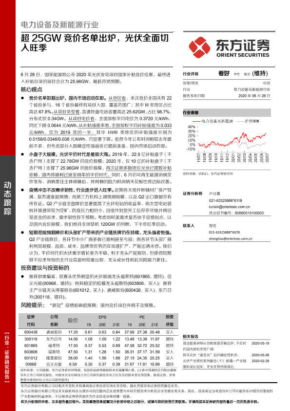 【东方证券】【20200628】电力设备及新能源行业动态跟踪:超25GW竞价名单出炉,光伏全面切入旺季-3页