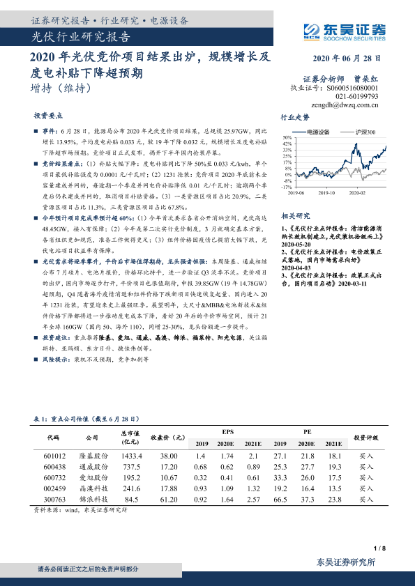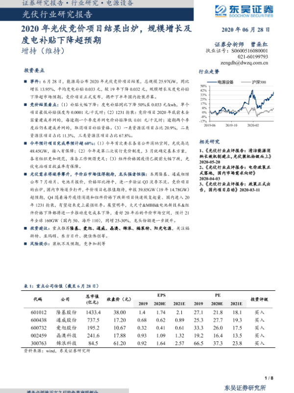 【东吴证券】【20200628】2020年光伏竞价项目结果出炉,规模增长及度电补贴下降超预期-8页