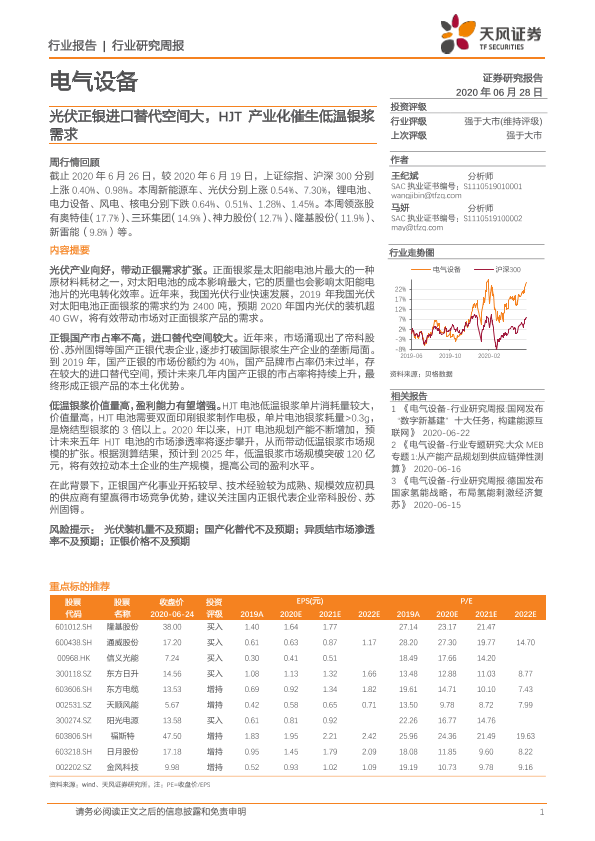 【天风证券】【20200628】电气设备行业研究周报:光伏正银进口替代空间大,HJT产业化催生低温银浆需求-15页
