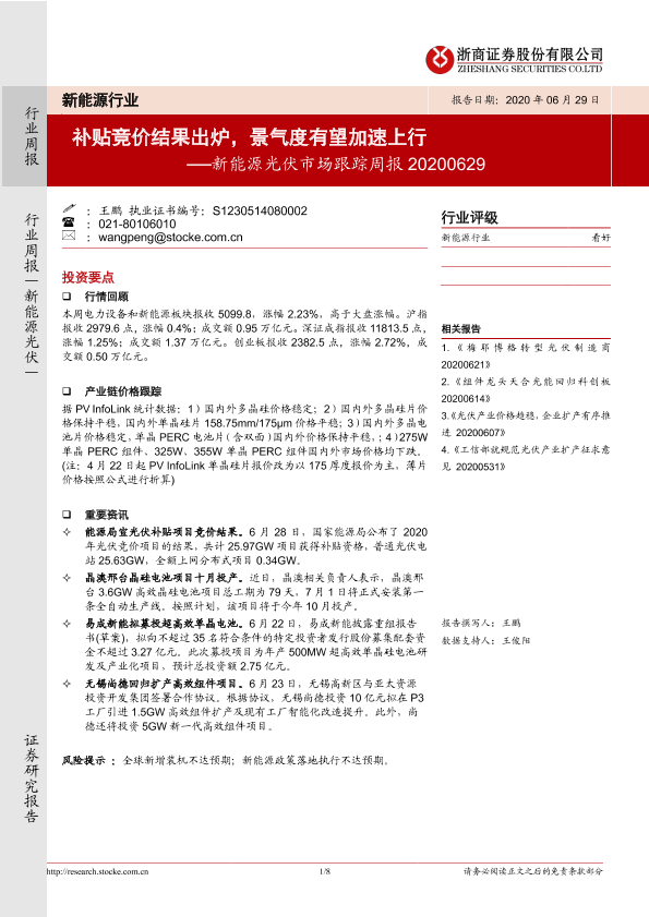 【浙商证券】【20200629】20200629-浙商证券-新能源光伏市场跟踪周报:补贴竞价结果出炉,景气度有望加速上行-8页