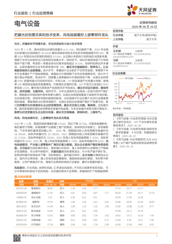【天风证券】【20200629】电气设备行业投资策略:把握光伏供需关系和技术变革,风电抢装看好上游零部件龙头-30页