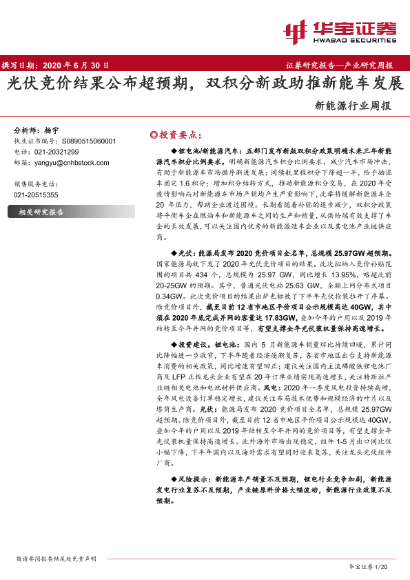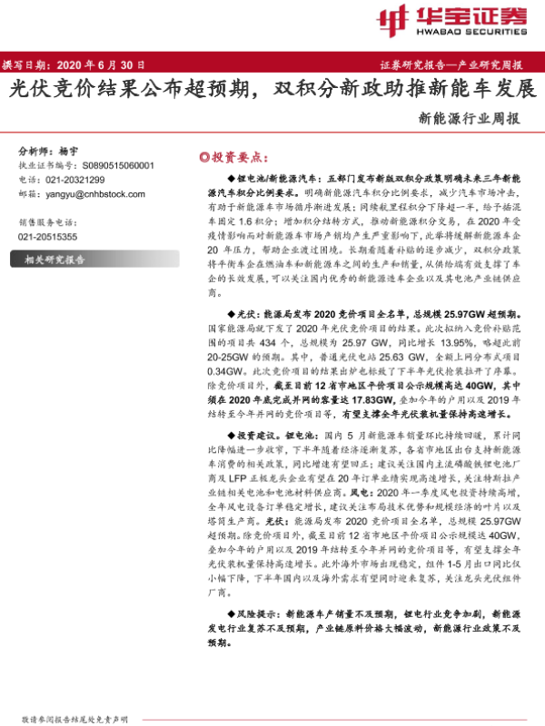 【华宝证券】【20200630】20200630-华宝证券-新能源行业周报:光伏竞价结果公布超预期,双积分新政助推新能车发展-20页