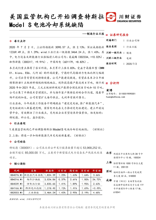 【川财证券】【20200702】制造行业日报:美国监管机构已开始调查特斯拉Model S电池冷却系统缺陷-3页