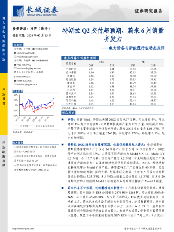【长城证券】【20200703】电力设备与新能源行业动态点评:特斯拉Q2交付超预期,蔚来6月销量齐发力-3页