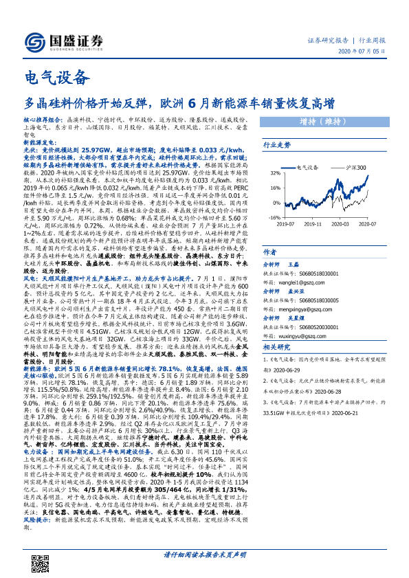 【国盛证券】【20200705】电气设备行业周报:多晶硅料价格开始反弹,欧洲6月新能源车销量恢复高增-14页