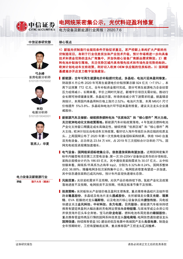 【中信证券】【20200706】电力设备及新能源行业周报:电网统采密集公示,光伏料迎盈利修复-15页