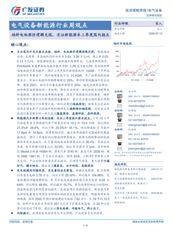 【广发证券】【20200712】电气设备新能源行业周观点:硅料电池涨价逻辑兑现,关注新能源车三季度国内拐点-4页