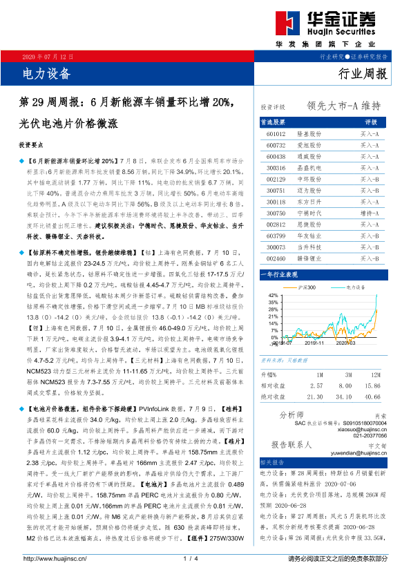 【华金证券】【20200712】电力设备行业第29周周报:6月新能源车销量环比增20%,光伏电池片价格微涨-4页
