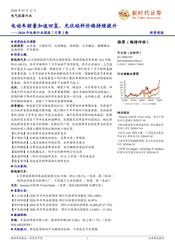 【新时代证券】【20200712】2020年电新行业周报7月第2期:电动车销量加速回复,光伏硅料价格持续提升-14页