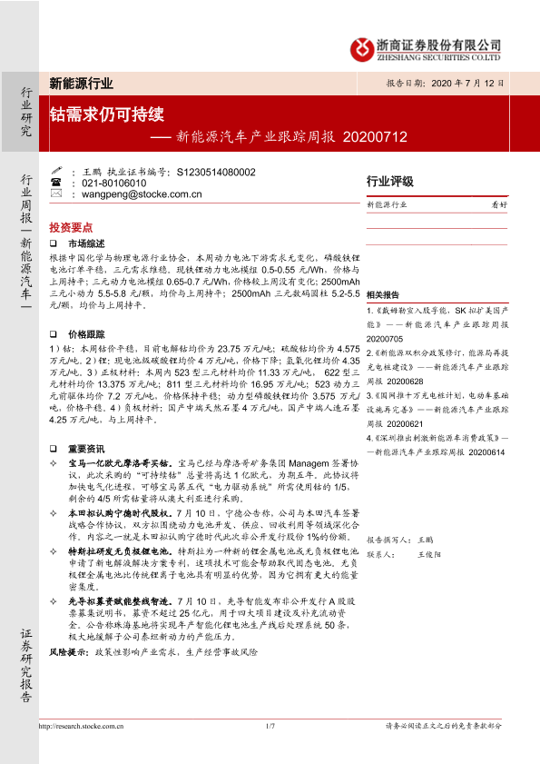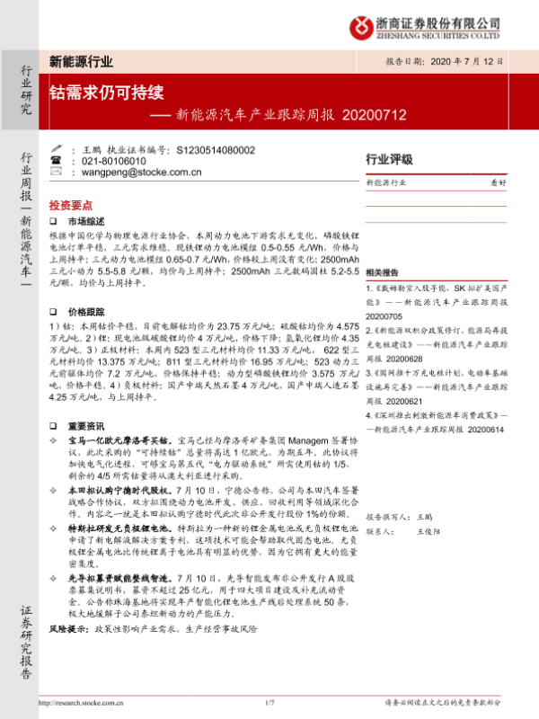 【浙商证券】【20200712】20200712-浙商证券-新能源汽车产业跟踪周报:钴需求仍可持续-7页