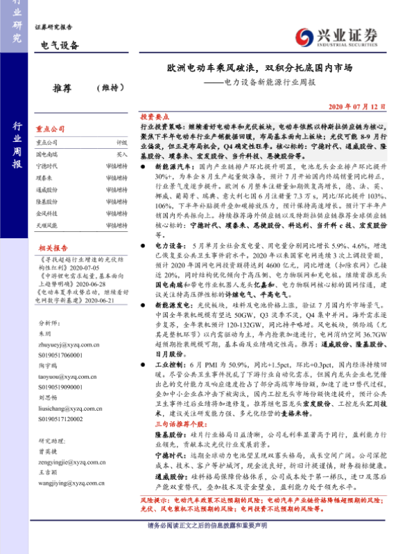 【兴业证券】【20200712】欧洲电动车乘风破浪,双积分托底国内市场——电力设备新能源行业周报-27页