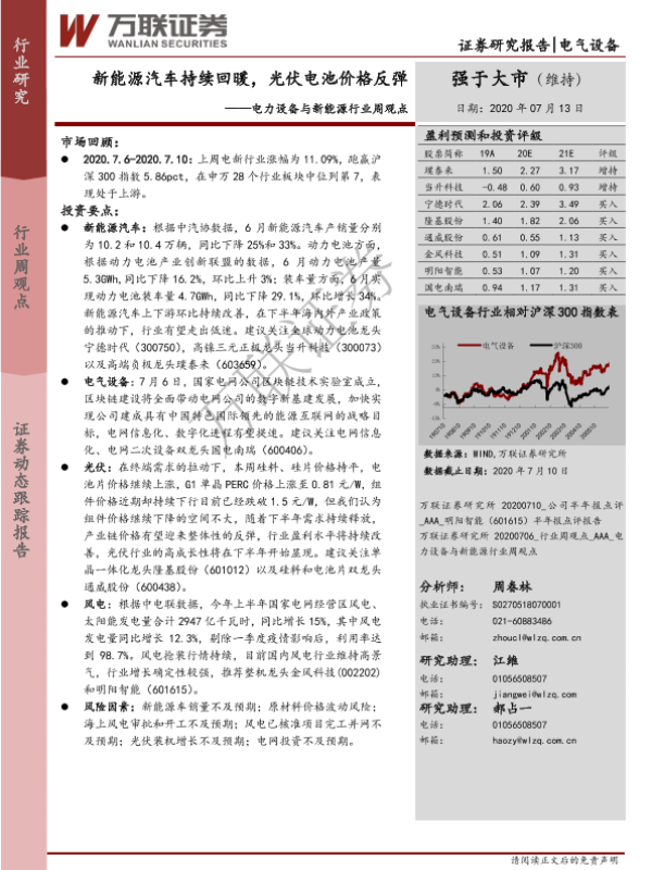 【万联证券】【20200713】电力设备与新能源行业周观点:新能源汽车持续回暖,光伏电池价格反弹-12页