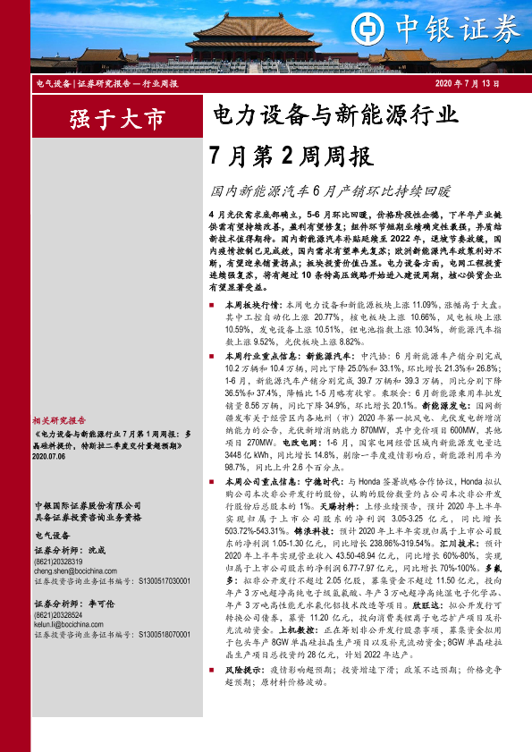 【中银证券】【20200713】电力设备与新能源行业7月第2周周报:国内新能源汽车6月产销环比持续回暖-19页