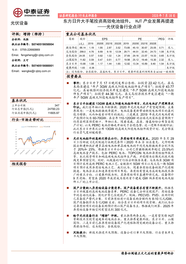 【中泰证券】【20200718】光伏设备行业点评:东方日升大手笔投资高效电池组件,HJT产业发展再提速-2页