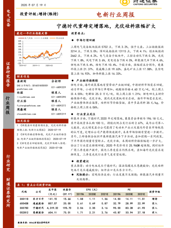 【财通证券】【20200719】电新行业周报:宁德时代重磅定增落地,光伏硅料涨幅扩大-16页