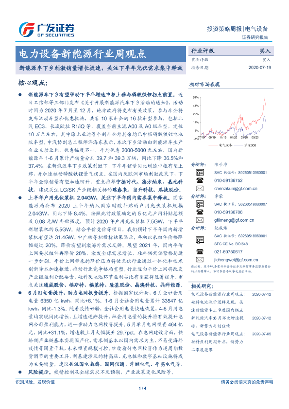 【广发证券】【20200719】电力设备新能源行业周观点:新能源车下乡刺激销量增长提速,关注下半年光伏需求集中释放-4页