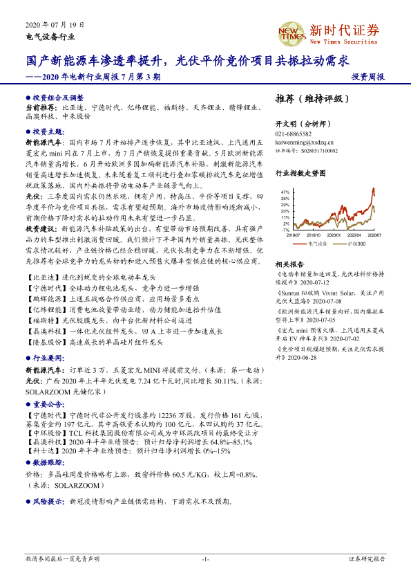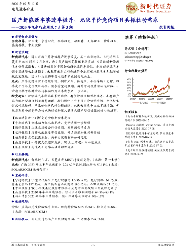 【新时代证券】【20200719】2020年电新行业周报7月第3期:国产新能源车渗透率提升,光伏平价竞价项目共振拉动需求-13页