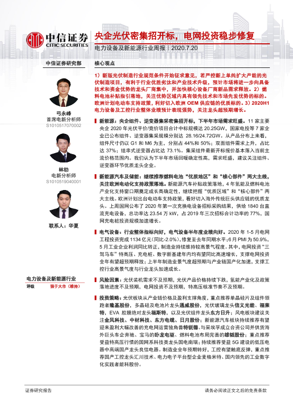 【中信证券】【20200720】电力设备及新能源行业周报:央企光伏密集招开标,电网投资稳步修复-14页