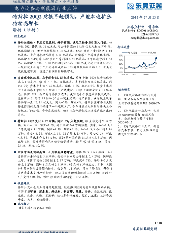 【东吴证券】【20200723】电力设备与新能源行业点评:特斯拉20Q2财报再超预期,产能加速扩张持续高增长-18页