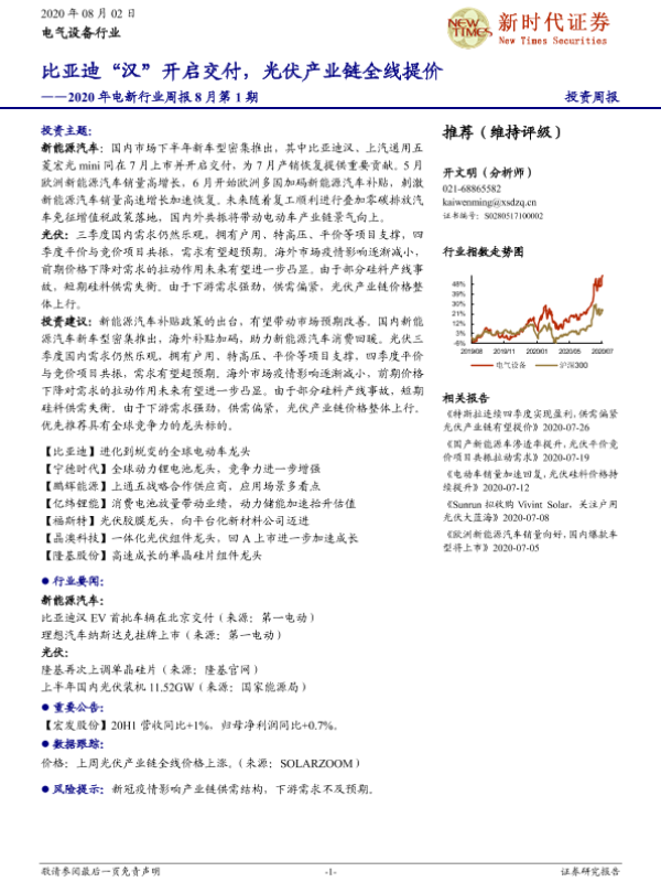 【新时代证券】【20200802】2020年电新行业周报8月第1期:比亚迪“汉”开启交付,光伏产业链全线提价-13页