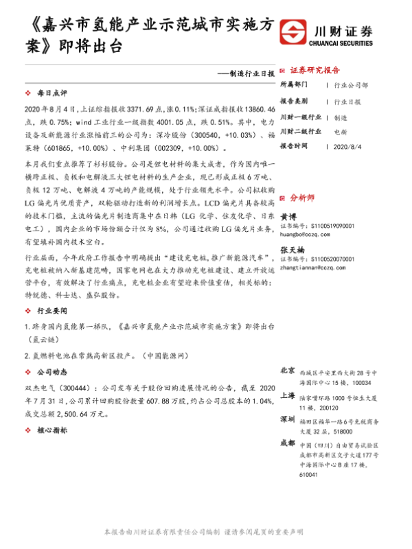 【川财证券】【20200804】制造行业日报:《嘉兴市氢能产业示范城市实施方案》即将出台-4页