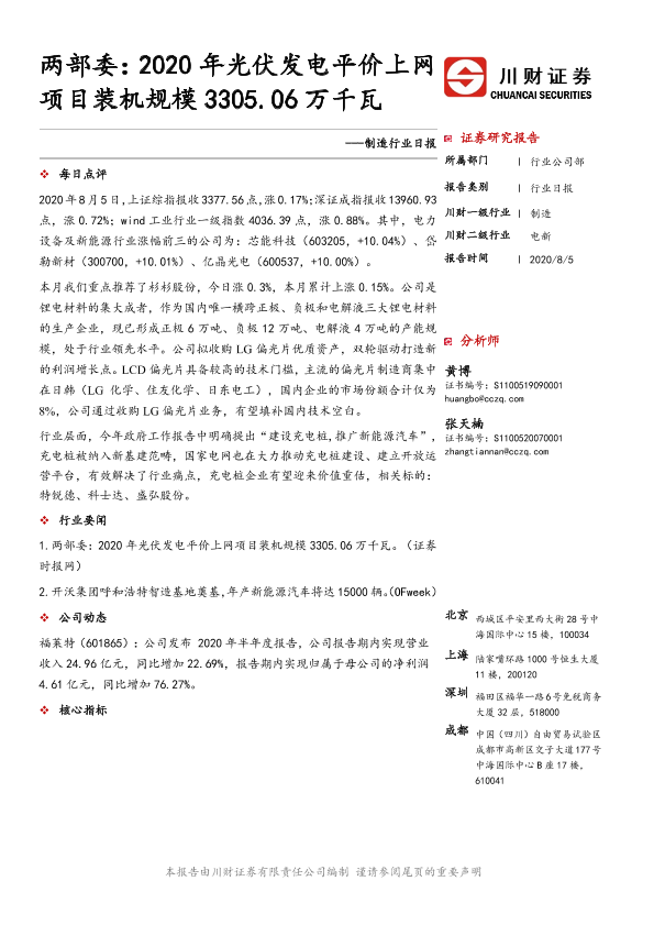 【川财证券】【20200805】2020年光伏发电平价上网项目装机规模3305.06万千瓦-4页