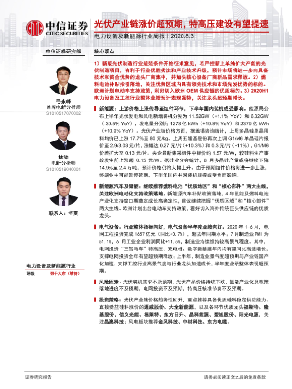 【中信证券】【20200803】电力设备及新能源行业周报:光伏产业链涨价超预期,特高压建设有望提速-16页