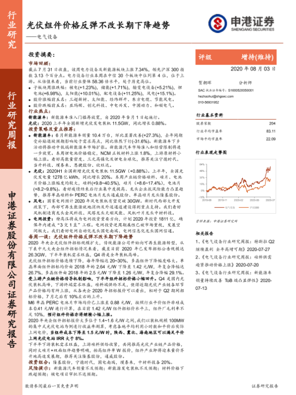 【申港证券】【20200803】20200803-申港证券-电气设备行业研究周报:光伏组件价格反弹不改长期下降趋势-36页