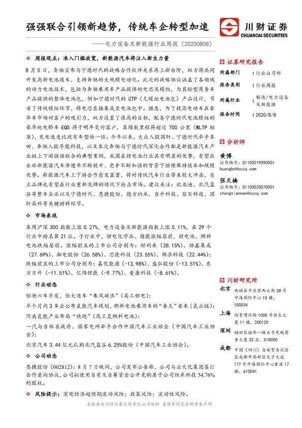 【川财证券】【20200808】电力设备及新能源行业周报:强强联合引领新趋势,传统车企转型加速-17页