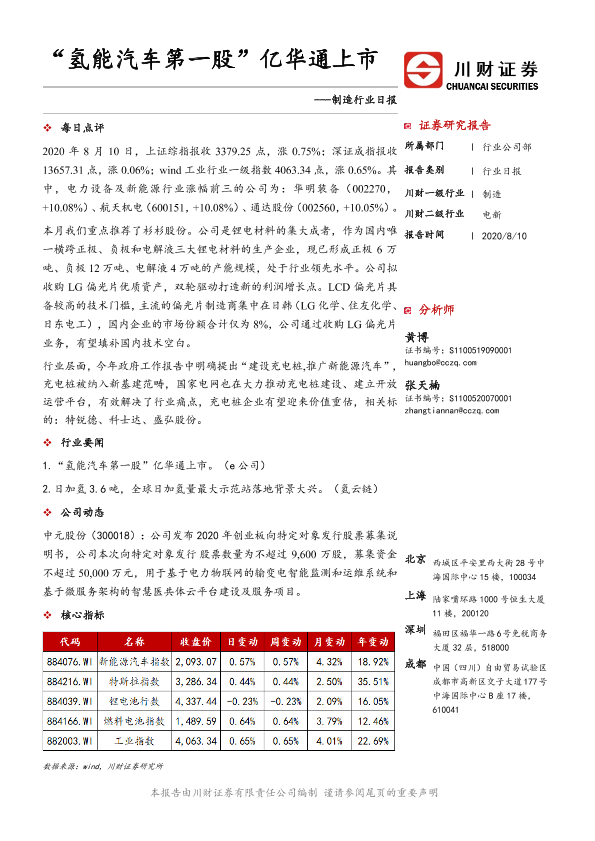 【川财证券】【20200810】制造行业日报:“氢能汽车第一股”亿华通上市-3页