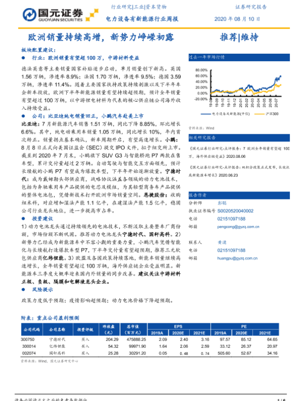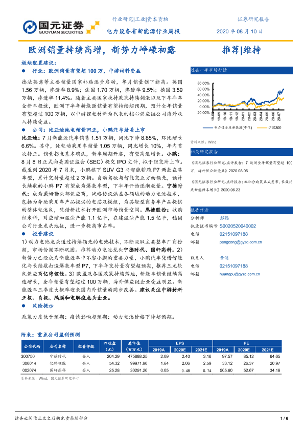 【国元证券】【20200810】电力设备有新能源行业周报:欧洲销量持续高增,新势力峥嵘初露-6页