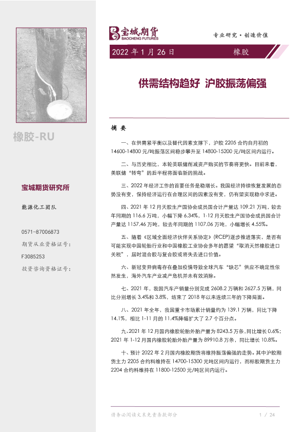【宝城期货】【20220126】橡胶月报:供需结构趋好,沪胶振荡偏强-42页
