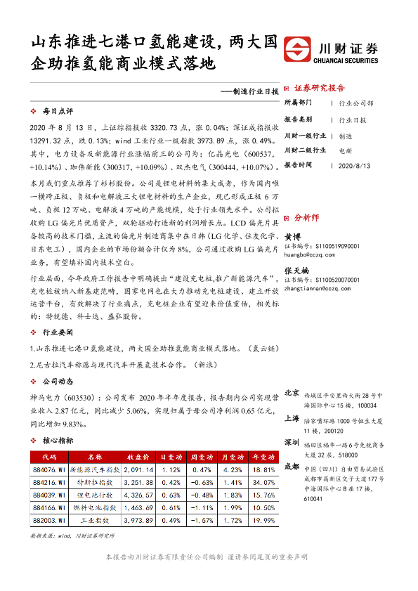【川财证券】【20200813】制造行业日报:山东推进七港口氢能建设,两大国企助推氢能商业模式落地-3页