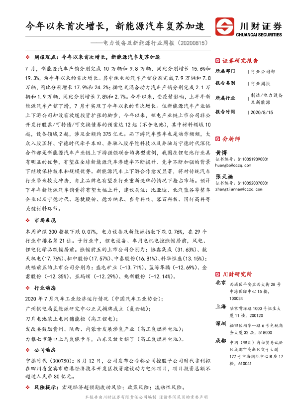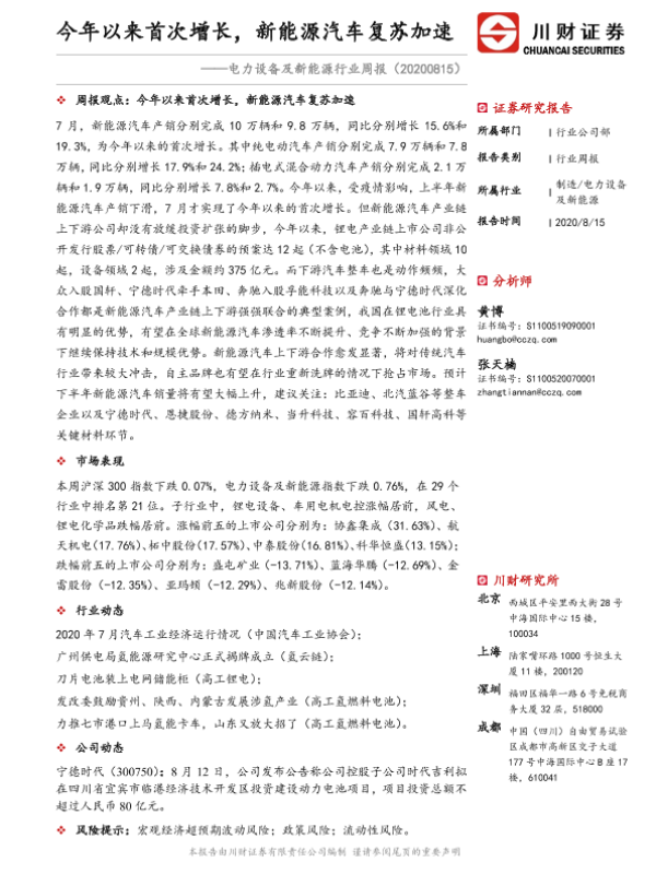 【川财证券】【20200815】电力设备及新能源行业周报:今年以来首次增长,新能源汽车复苏加速-16页
