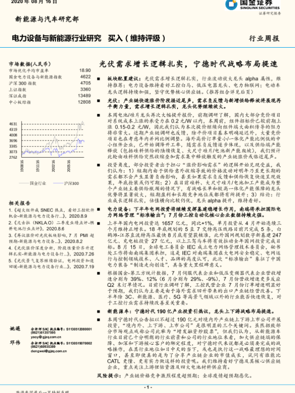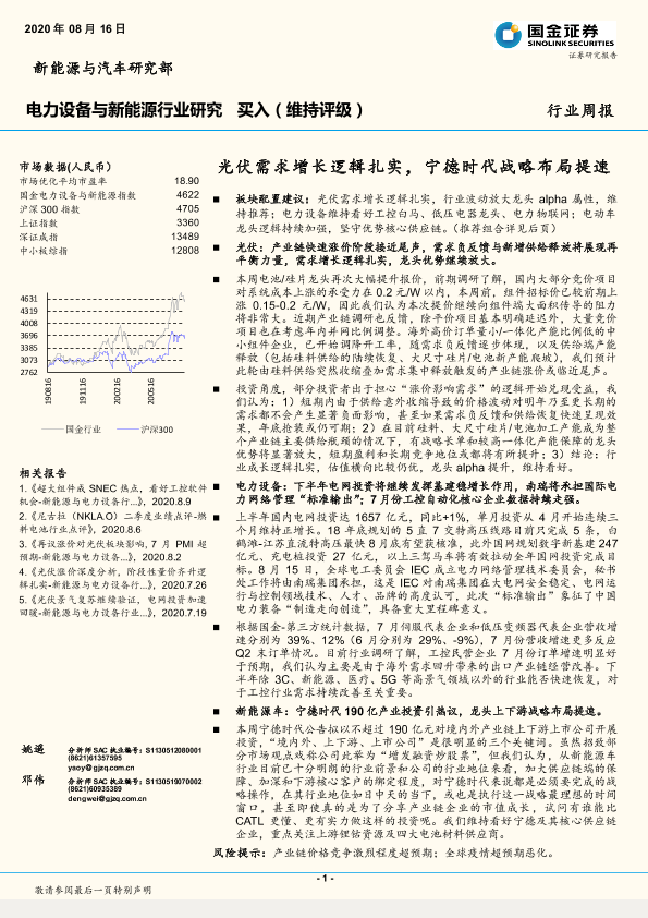 【国金证券】【20200816】电力设备与新能源行业研究:光伏需求增长逻辑扎实,宁德时代战略布局提速-4页