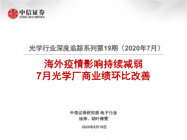 【中信证券】【20200818】光学行业深度追踪系列第19期(2020年7月):海外疫情影响持续减弱 7月光学厂商业绩环比改善-22页