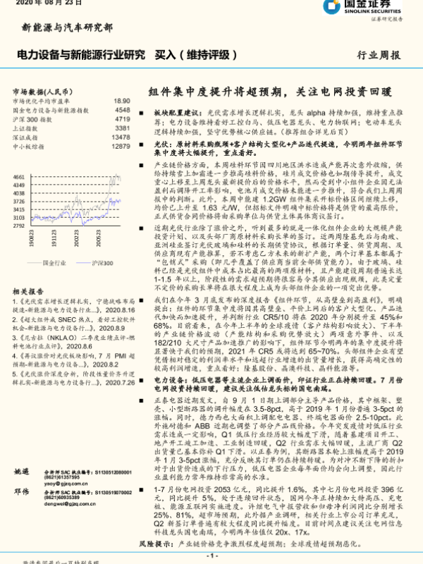 【国金证券】【20200823】电力设备与新能源行业研究:组件集中度提升将超预期,关注电网投资回暖-4页