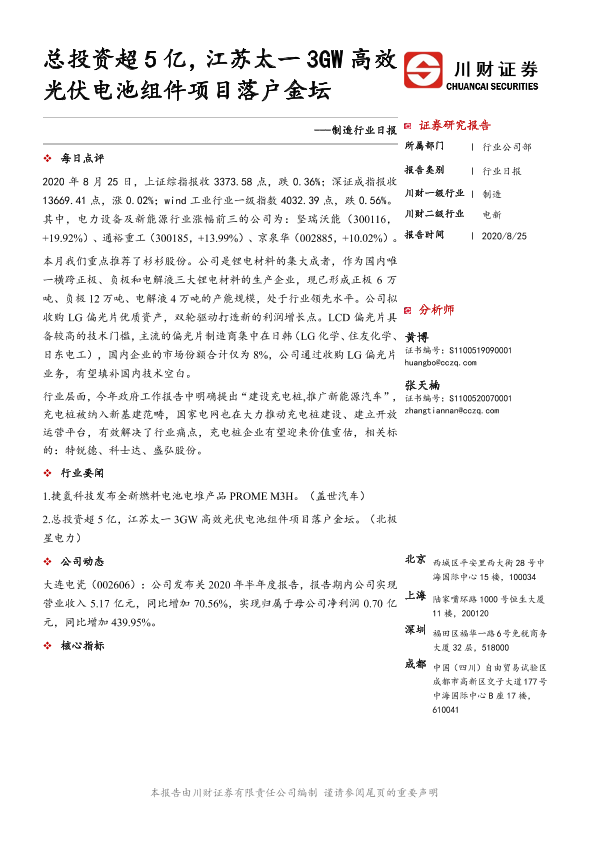 【川财证券】【20200825】制造行业日报:总投资超5亿,江苏太一3GW高效光伏电池组件项目落户金坛-3页