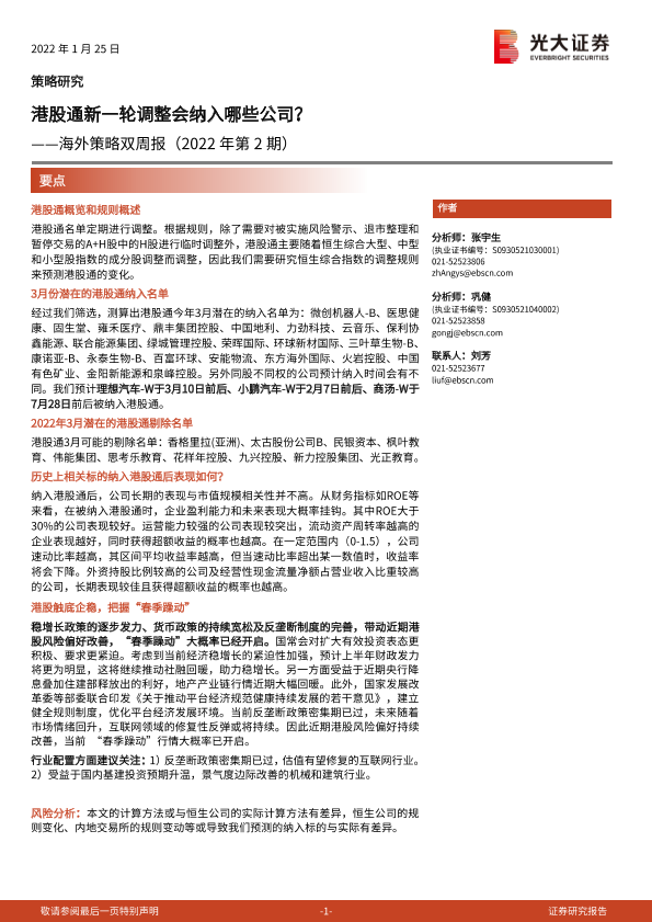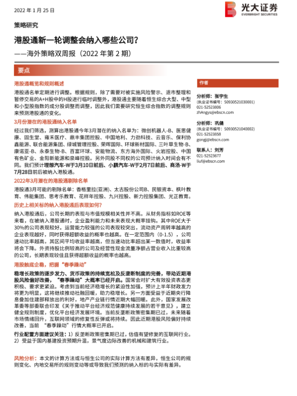 【光大证券】【20220125】海外策略双周报(2022年第2期):港股通新一轮调整会纳入哪些公司?-15页
