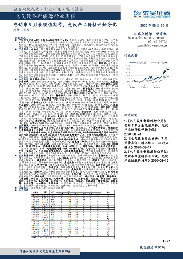 【东吴证券】【20200830】电气设备新能源行业周报:电动车9月表现值期待,光伏产品价格开始分化-42页