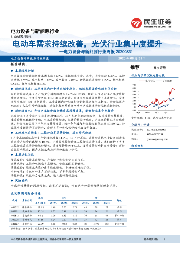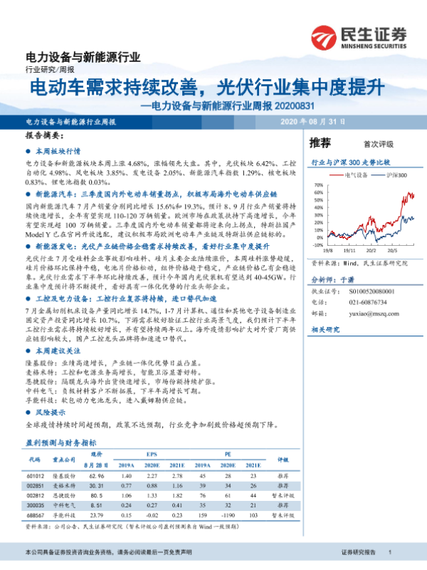 【民生证券】【20200831】电力设备与新能源行业周报:电动车需求持续改善,光伏行业集中度提升-16页