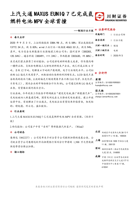 【川财证券】【20200903】制造行业日报:上汽大通MAXUS EUNIQ 7已完成氢燃料电池MPV全球首撞-3页