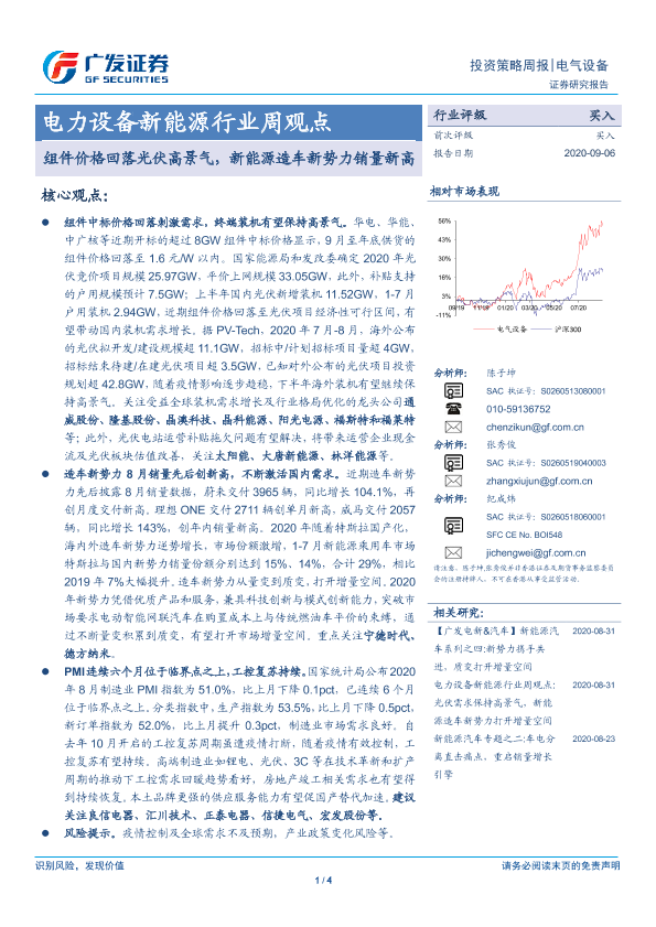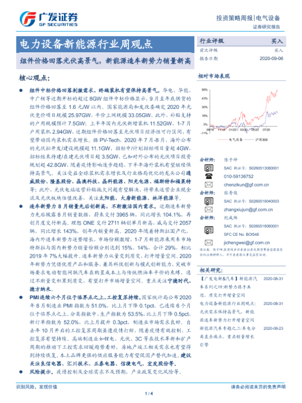 【广发证券】【20200906】电力设备新能源行业周观点:组件价格回落光伏高景气,新能源造车新势力销量新高-4页