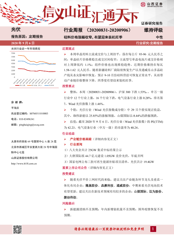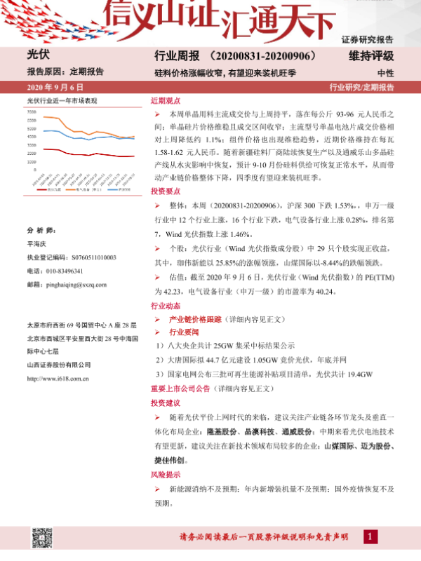 【山西证券】【20200906】20200906-山西证券-光伏行业周报:硅料价格涨幅收窄,有望迎来装机旺季-11页