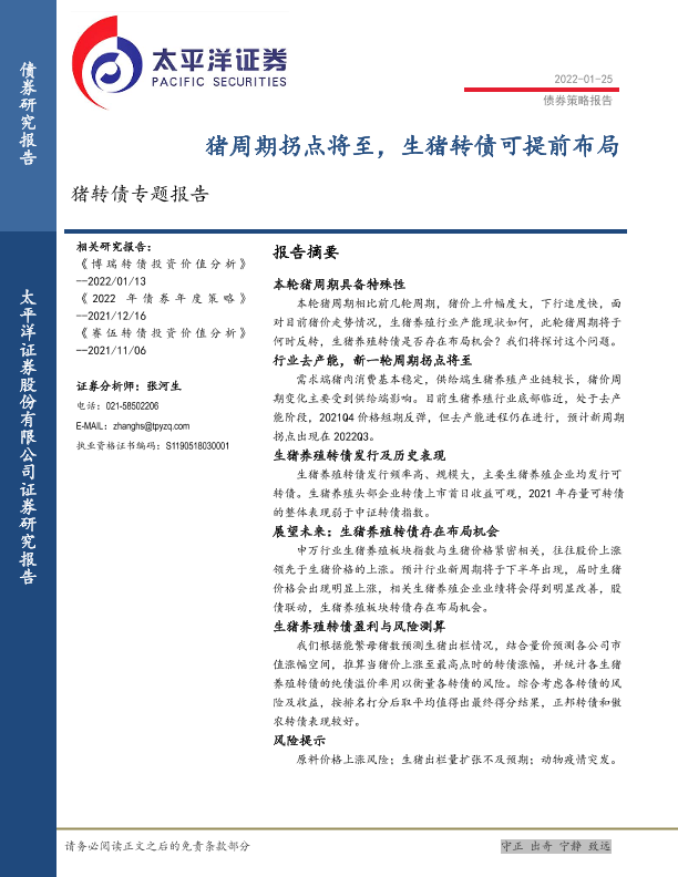 【太平洋证券】【20220125】猪转债专题报告:猪周期拐点将至,生猪转债可提前布局-18页