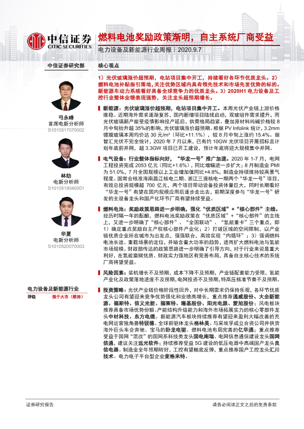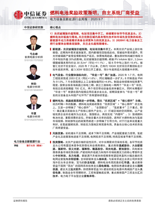 【中信证券】【20200907】电力设备及新能源行业周报:燃料电池奖励政策渐明,自主系统厂商受益-19页