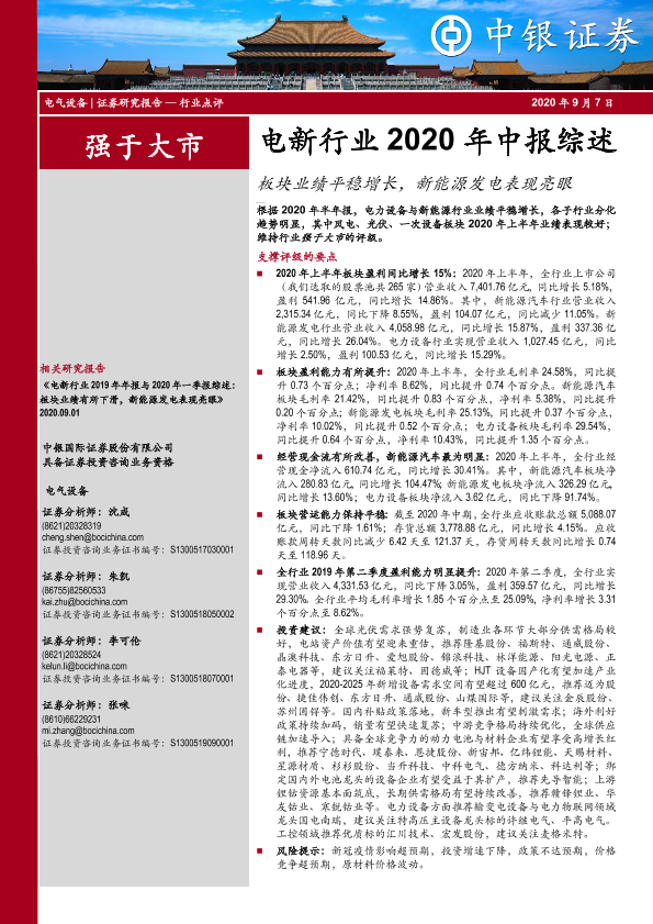 【中银证券】【20200907】电新行业2020年中报综述:板块业绩平稳增长,新能源发电表现亮眼-17页