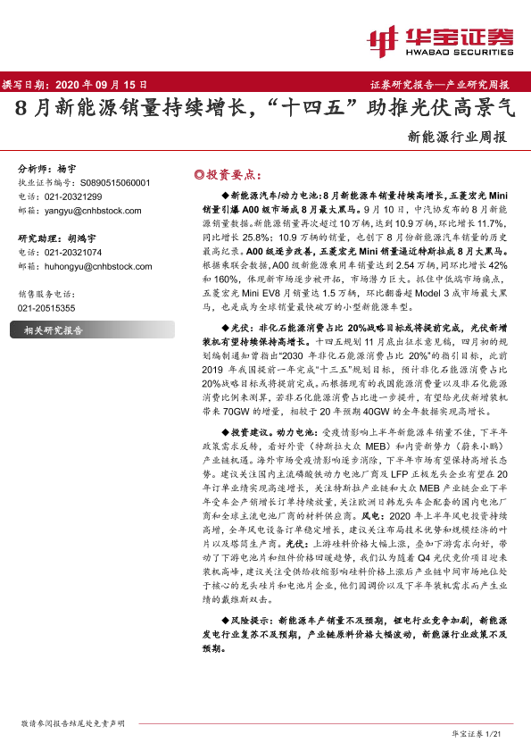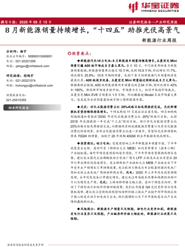 【华宝证券】【20200915】20200915-华宝证券-新能源行业周报:8月新能源销量持续增长,“十四五”助推光伏高景气-21页