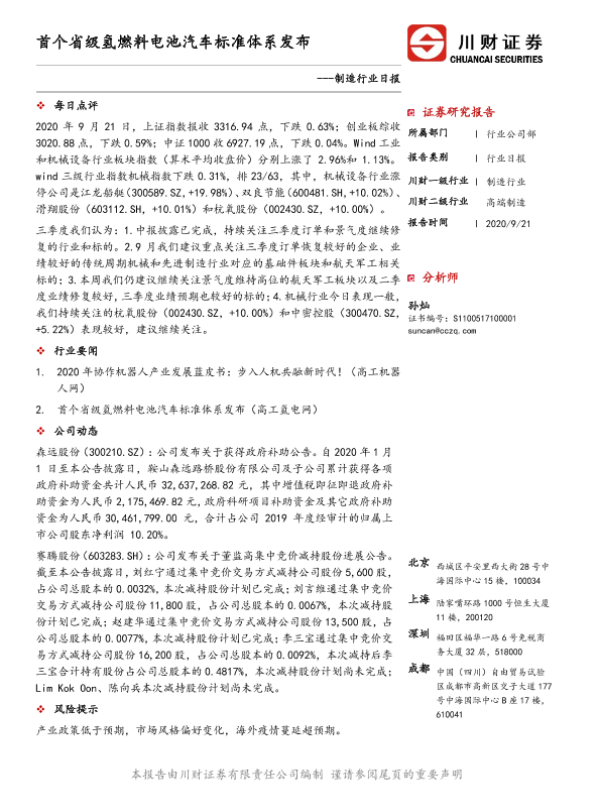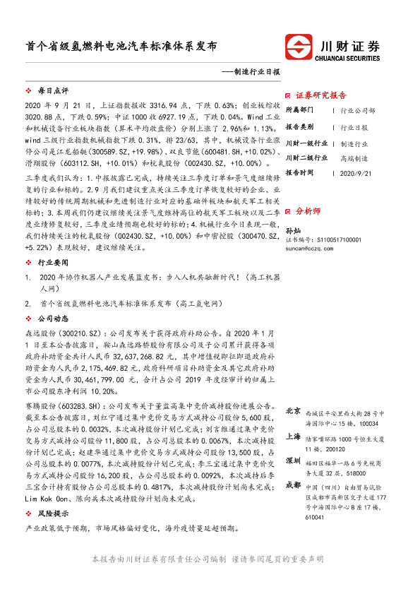 【川财证券】【20200921】制造行业日报:首个省级氢燃料电池汽车标准体系发布-2页
