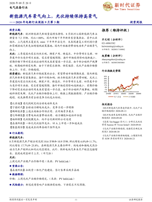 【新时代证券】【20200920】2020年电新行业周报9月第3期:新能源汽车景气向上,光伏持续保持高景气-13页